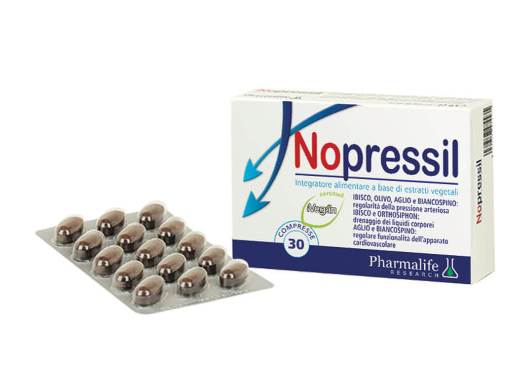 NOPRESSIL: Integrator Alimentar për rregullimin e presionit arterior dhe drenimin e lëngjeve trupore. Përdorimi: 1 tablet në mëngjes dhe 1 në darkë..